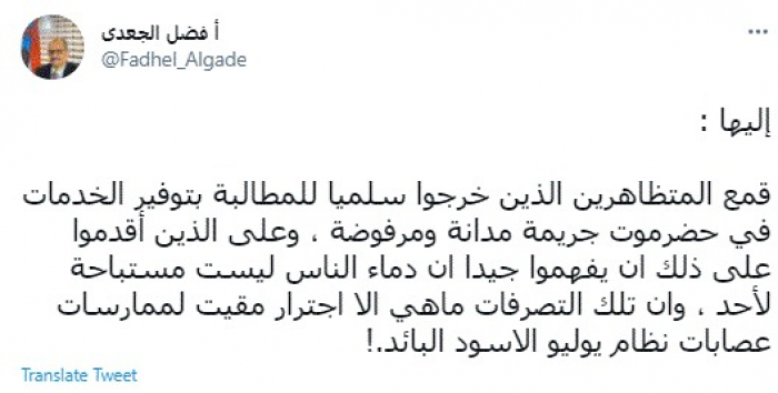 أدان عضو هيئة رئاسة المجلس الانتقالي الجنوبي فضل الجعدي، اليوم، قمع التظاهرات المطالبة بتوفير الخدمات في حضرموت.
