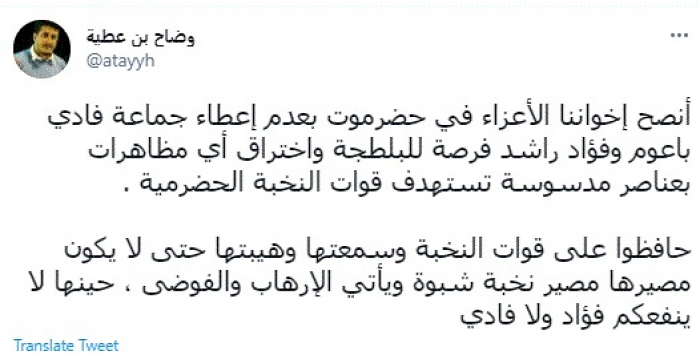 وقال في تغريدة عبر "تويتر" رصدها "المشهد العربي": "أنصح إخواننا الأعزاء في حضرموت بعدم إعطاء جماعة فادي باعوم وفؤاد راشد فرصة للبلطجة واختراق أي مظاهرات بعناصر مدسوسة تستهدف قوات النخبة الحضرمية".