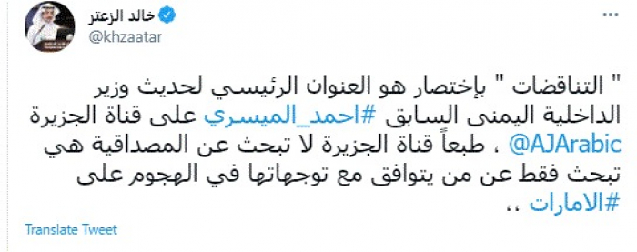 وكتب في تغريدة عبر "تويتر" رصدها "المشهد العربي": "التناقضات باختصار هي العنوان الرئيسي لحديث وزير الداخلية اليمني السابق أحمد الميسري على قناة الجزيرة، طبعًا قناة الجزيرة لا تبحث عن المصداقية هي تبحث فقط عن من يتوافق مع توجهاتها في الهجوم على الإمارات ".