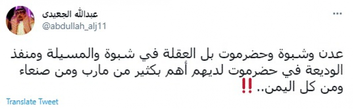 وقال في تغريدة عبر "تويتر" رصدها "المشهد العربي": "عدن وشبوة وحضرموت بل العقلة في شبوة والمسيلة ومنفذ الوديعة في حضرموت لديهم أهم بكثير من مأرب ومن صنعاء ومن كل اليمن".
