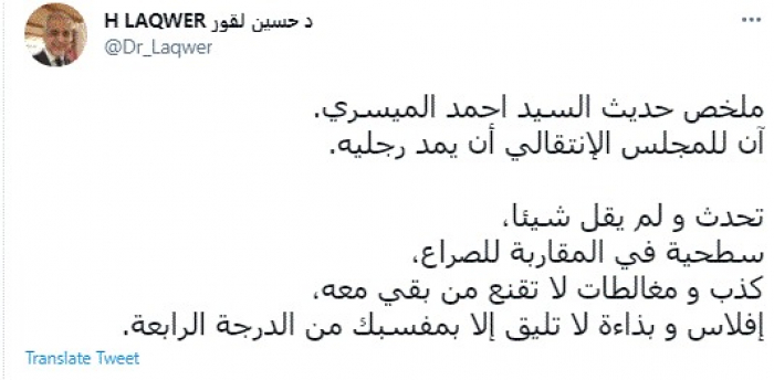 وقال في تغريدة عبر "تويتر" رصدها "المشهد العربي": "ملخص حديث السيد أحمد الميسري. آن للمجلس الانتقالي أن يمد رجليه".