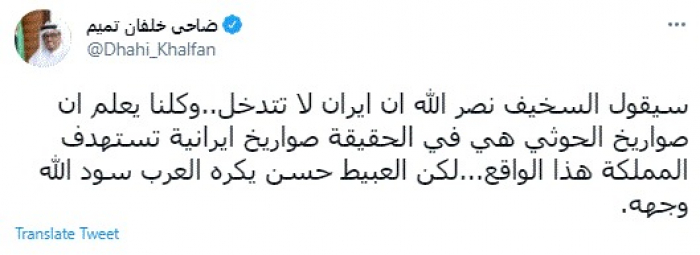 وقال في تغريدة عبر "تويتر" رصدها "المشهد العربي": "سيقول السخيف نصر الله أن إيران لا تتدخل.. وكلنا يعلم أن صواريخ الحوثي هي في الحقيقة صواريخ إيرانية تستهدف المملكة هذا الواقع...لكن العبيط حسن يكره العرب سود الله وجهه".