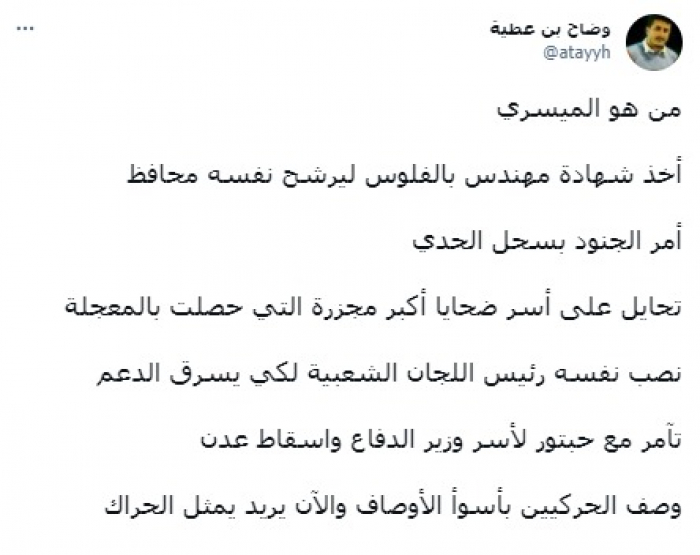 فضح وضاح بن عطية عضو الجمعية الوطنية، التاريخ الأسود للمدعو الميسري وتورطه في مجازر بالجنوب للوصول إلى مناصب قيادية، وسرقة دعم اللجان الشعبية.