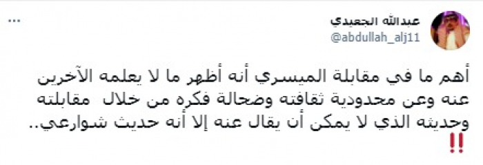 وشدد في تغريدة على حسابه بموقع التدوين المصغر تويتر، اليوم على أن: "أهم ما في مقابلة الميسري أنه أظهر ما لا يعلمه الآخرون عنه وعن محدودية ثقافته وضحالة فكره من خلال مقابلته وحديثه الذي لا يمكن أن يقال عنه إلا أنه حديث .....".