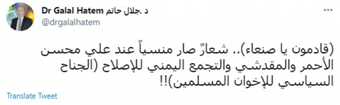 وكتب في تغريدة عبر "تويتر" رصدها "المشهد العربي": "(قادمون يا صنعاء).. شعارٌ صار منسيًا عند علي محسن الأحمر والمقدشي والتجمع اليمني للإصلاح (الجناح السياسي للإخوان المسلمين)".