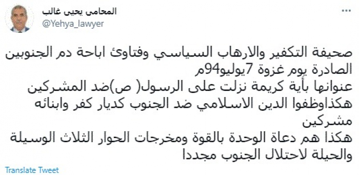 وقال في تغريدة عبر "تويتر" رصدها "المشهد العربي": "صحيفة التكفير والارهاب السياسي وفتاوى إباحة دم الجنوبين الصادرة يوم غزوة 7يوليو94م عنوانها بأية كريمة نزلت على الرسول( ص) ضد المشركين".