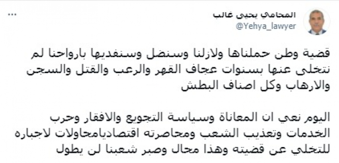 وشدد في تغريدة على حسابه بموقع التدوين المصغر تويتر، اليوم على أنها: "قضية وطن حملناها ولازلنا وسنظل وسنفديها بأرواحنا".