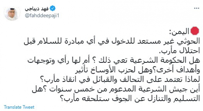 ديباجي يتساءل: أين جيش الشرعية المدعوم منذ 5 سنوات من نوايا الحوثي بمأرب؟