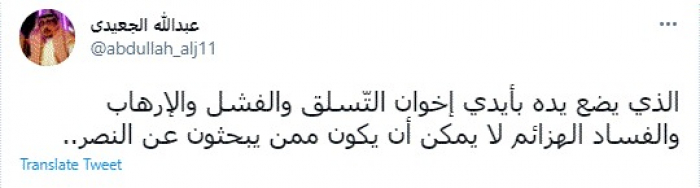 وكتب في تغريدة عبر "تويتر" رصدها "المشهد العربي": "الذي يضع يده بأيدي إخوان التّسلق والفشل والإرهاب والفساد الهزائم لا يمكن أن يكون ممن يبحثون عن النصر".