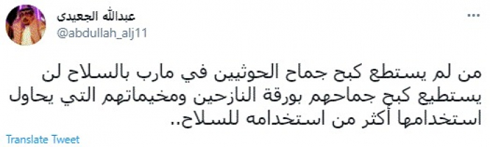 وقال في تغريدة عبر "تويتر" رصدها "المشهد العربي": "من لم يستطع كبح جماح الحوثيين في مأرب بالسلاح لن يستطيع كبح جماحهم بورقة النازحين ومخيماتهم التي يحاول استخدامها أكثر من استخدامه للسلاح".