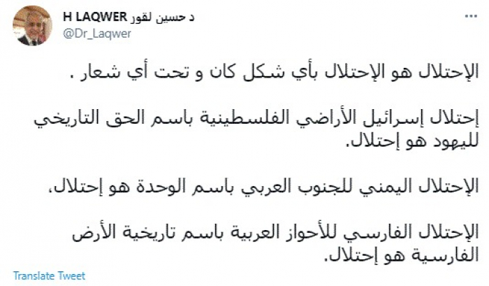 وأضاف: "احتلال إسرائيل الأراضي الفلسطينية باسم الحق التاريخي لليهود هو احتلال... الاحتلال اليمني للجنوب العربي باسم الوحدة هو احتلال، الاحتلال الفارسي للأحواز العربية باسم تاريخية الأرض الفارسية هو احتلال".