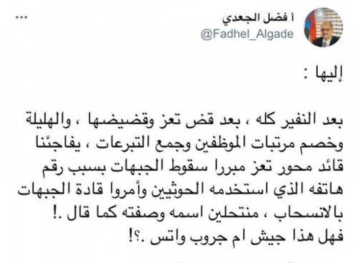 سخر عضو هيئة رئاسة المجلس الانتقالي الجنوبي، فضل الجعدي، من الإخواني المدعو خالد فاضل، قائد محور تعز، بعد انسحابه وجيشه من الجبهات معللا -الأخير- انسحابه بسبب رقم هاتفه: "بعد النفير كله، بعد قض تعز وقضيضها، والهليلة وخصم مرتبات الموظفين وجمع التبرعات، يفاجئنا قائد محور تعز مبررا سقوط الجبهات بسبب رقم هاتفه الذي استخدمه الحوثيون وأمروا قادة الجبهات بالانسحاب، منتحلين اسمه وصفته كما قال!".