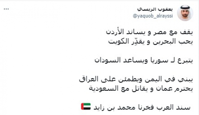 وقال في تغريدة على حسابه بموقع التدوين المصغر تويتر، اليوم إنه: "يقف مع مصر ويساند الأردن، يحب البحرين ويقدِّر الكويت، يتبرع لـ سوريا ويساعد السودان، يبني في اليمن ويطمئن على العراق، يحترم عمان و يقاتل مع السعودية".