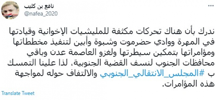 وكتب في تغريدة عبر "تويتر" رصدها "المشهد العربي": "ندرك بأن هناك تحركات مكثفة للمليشيات الإخوانية وقيادتها في المهرة ووادي حضرموت وشبوة وأبين لتنفيذ مخططاتها ومؤامراتها بتمكين سيطرتها ولغزو العاصمة عدن وباقي محافظات الجنوب لنسف القضية الجنوبية، لذا علينا التمسك بالمجلس الانتقالي الجنوبي والالتفاف حوله لمواجهة هذه المؤامرات".
