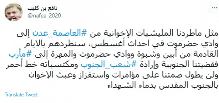 وكتب في تغريدة عبر "تويتر" رصدها "المشهد العربي": "مثل ما طردنا المليشيات الإخوانية من العاصمة عدن إلى وادي حضرموت في أحداث أغسطس، سنطردهم بالأيام القادمة من أبين وشبوة ووادي حضرموت والمهرة إلى مأرب فقضيتنا الجنوبية وإرادة شعب الجنوب ومكتسباته خط أحمر ولن يطول صمتنا على مؤامرات واستفزاز وعبث الإخوان بالجنوب المقدس بدماء الشهداء".