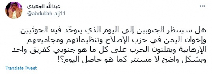 وقال في تغريدة عبر "تويتر" رصدها "المشهد العربي": "هل سينتظر الجنوبين إلى اليوم الذي يتوحّد فيه الحوثيين وإخوان اليمن في حزب الإصلاح وتنظيماتهم ومجاميعهم الإرهابية ويعلنون الحرب على كل ما هو جنوبي كفريق واحد وبشكل واضح لا مستتر كما هو حاصل اليوم؟".