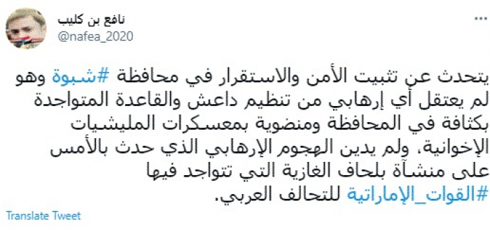 وقال في تغريدة عبر "تويتر" رصدها "المشهد العربي": "يتحدث عن تثبيت الأمن والاستقرار في محافظة شبوة وهو لم يعتقل أي إرهابي من تنظيم داعش والقاعدة المتواجدة بكثافة في المحافظة ومنضوية بمعسكرات المليشيات الإخوانية، ولم يدين الهجوم الإرهابي الذي حدث بالأمس على منشآة بلحاف الغازية التي تتواجد فيها القوات الإماراتية للتحالف العربي".