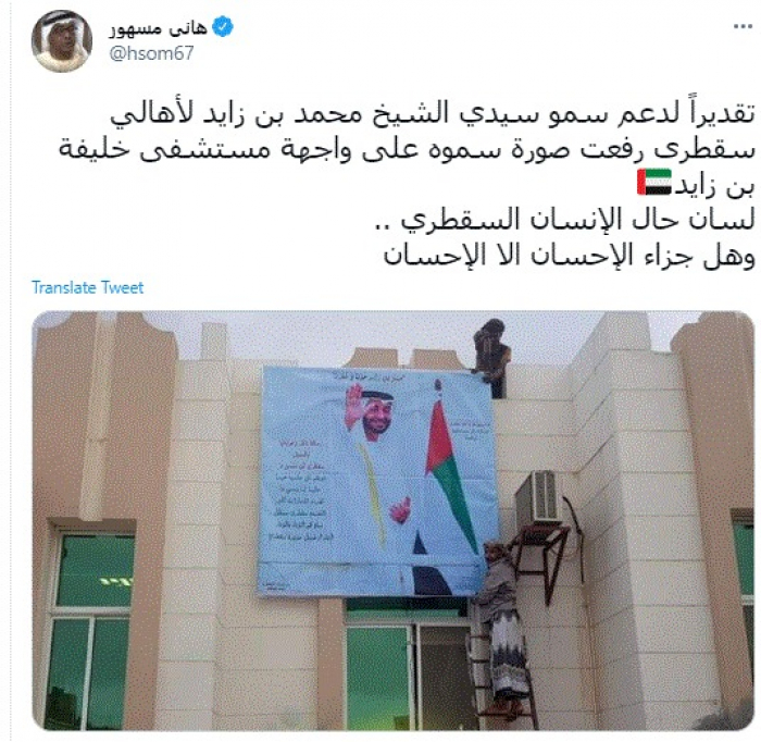 وقال في تغريدة عبر "تويتر" رصدها "المشهد العربي": " تقديرًا لدعم سمو سيدي الشيخ محمد بن زايد لأهالي سقطرى رفعت صورة سموه على واجهة مستشفى خليفة بن زايد لسان حال الإنسان السقطري .. وهل جزاء الإحسان إلا الإحسان".