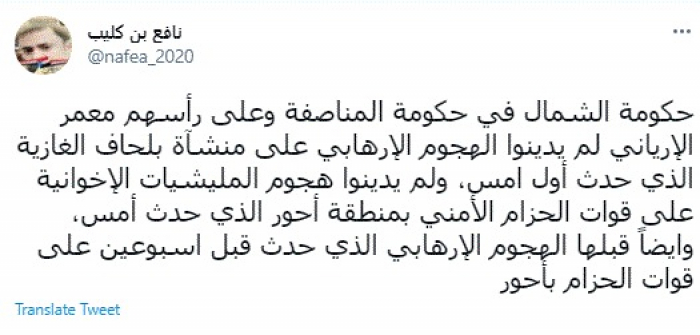 وكتب في تغريدة عبر "تويتر" رصدها "المشهد العربي": "حكومة الشمال في حكومة المناصفة وعلى رأسهم معمر الإرياني لم يدينوا الهجوم الإرهابي على منشآة بلحاف الغازية الذي حدث أول امس، ولم يدينوا هجوم المليشيات الإخوانية على قوات الحزام الأمني بمنطقة أحور الذي حدث أمس، وأيضًا قبلها الهجوم الإرهابي الذي حدث قبل أسبوعين على قوات الحزام بأحور".