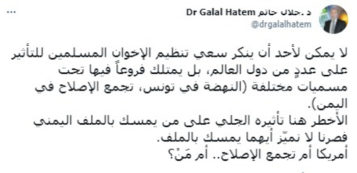 حاتم يحذر من تأثير اللوبي الإخواني العالمي على الملف اليمني