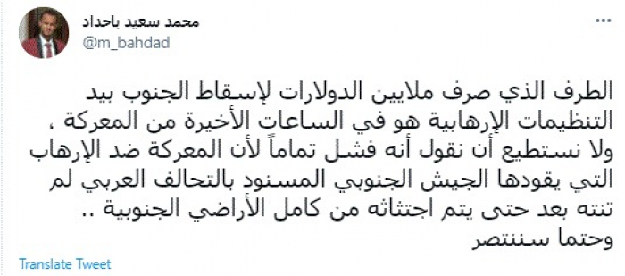 وكتب في تغريدة عبر "تويتر" رصدها "المشهد العربي": "الطرف الذي صرف ملايين الدولارات لإسقاط الجنوب بيد التنظيمات الإرهابية هو في الساعات الأخيرة من المعركة، ولا نستطيع أن نقول أنه فشل تمامًا لأن المعركة ضد الإرهاب التي يقودها الجيش الجنوبي المسنود بالتحالف العربي لم تنته بعد حتى يتم اجتثاثه من كامل الأراضي الجنوبية .. وحتمًا سننتصر".