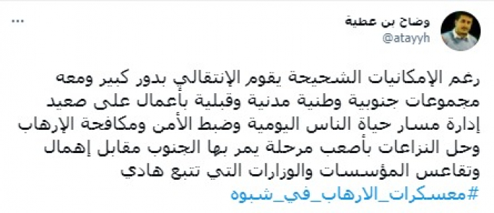 واعتبر أن جهود المجلس تأتي في: "مقابل إهمال وتقاعس المؤسسات والوزارات التي تتبع هادي"، مختتما بهاشتاج: "معسكرات الإرهاب في شبوة".