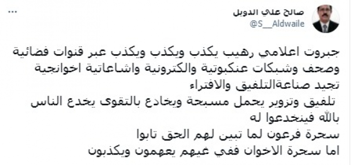 ورأى في تغريدة على حسابه بموقع التدوين المصغر تويتر، اليوم أنه: "جبروت إعلامي رهيب يكذب ويكذب ويكذب عبر قنوات فضائية وصحف وشبكات عنكبوتية وإلكترونية وإشاعاتية إخوانجية، تجيد صناعة التلفيق والافتراء".