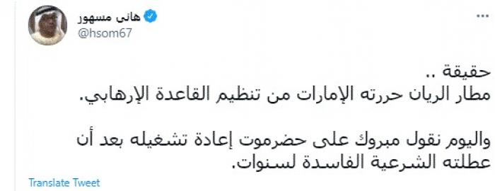 وقال في تغريدة عبر "تويتر" رصدها "المشهد العربي": "حقيقة.. مطار الريان حررته الإمارات من تنظيم القاعدة الإرهابي. واليوم نقول مبروك على حضرموت إعادة تشغيله بعد أن عطلته الشرعية الفاسدة لسنوات".