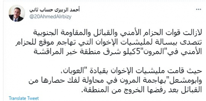 وكتب في تغريدة عبر "تويتر" رصدها "المشهد العربي": "لا زالت قوات الحزام الأمني والقبائل والمقاومة الجنوبية تتصدى ببسالة لمليشيات الإخوان التي تهاجم موقع للحزام الأمني في المرون 5 كيلو شرق منطقة خبر المراقشة".