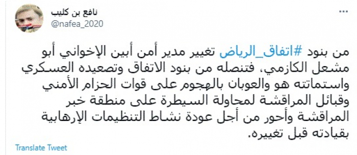 وقال في تغريدة عبر "تويتر" رصدها "المشهد العربي": "من بنود اتفاق الرياض تغيير مدير أمن أبين الإخواني أبو مشعل الكازمي".