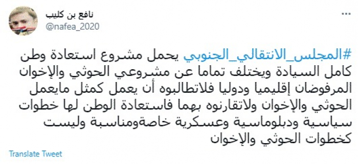 وكتب في تغريدة عبر "تويتر" رصدها "المشهد العربي": "المجلس الانتقالي الجنوبي يحمل مشروع استعادة وطن كامل السيادة ويختلف تماما عن مشروعي الحوثي والإخوان المرفوضان إقليميا ودوليا".