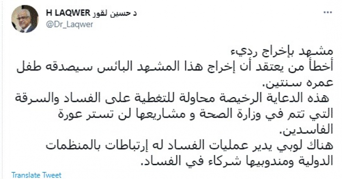 وأضاف: "هذه الدعاية الرخيصة محاولة للتغطية على الفساد والسرقة التي تتم في وزارة الصحة ومشاريعها لن تستر عورة الفاسدين".