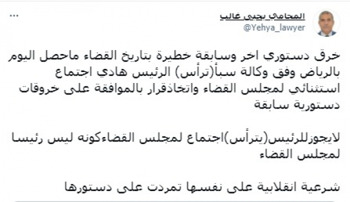 كشف الناشط السياسي يحيى غالب عن تورط الرئيس اليمني المؤقت عبدربه منصور هادي، في خرق دستوري برئاسته اجتماع مجلس القضاء واعتماده قرارات مخالفة للقانون.