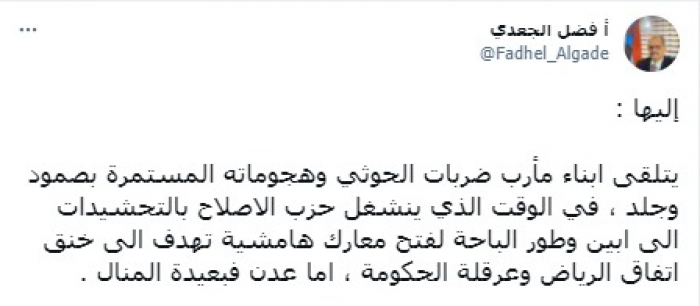الجعدي: مأرب تتلقى الضربات والشرعية الإخوانية تحشد بأبين