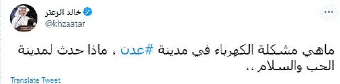 وقال في تغريدة عبر "تويتر" رصدها "المشهد العربي": "ما هي مشكلة الكهرباء في مدينة عدن، ماذا حدث لمدينة الحب والسلام".