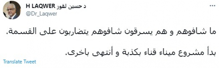 وكتب في تغريدة عبر "تويتر" رصدها "المشهد العربي": "ما شافوهم وهم يسرقون شافوهم يتضاربون على القسمة".