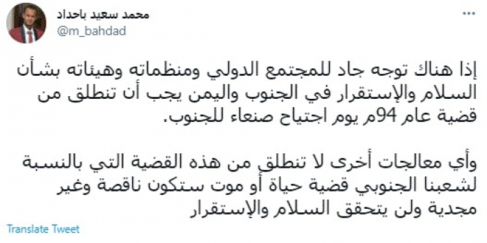 وكتب في تغريدة عبر "تويتر" رصدها "المشهد العربي": "إذا هناك توجه جاد للمجتمع الدولي ومنظماته وهيئاته بشأن السلام والاستقرار في الجنوب واليمن يجب أن تنطلق من قضية عام 94م يوم اجتياح صنعاء للجنوب".
