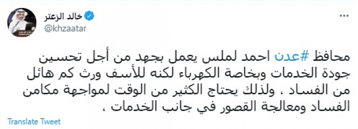 وكتب في تغريدة عبر "تويتر" رصدها "المشهد العربي": "محافظ عدن أحمد لملس يعمل بجهد من أجل تحسين جودة الخدمات وبخاصة الكهرباء لكنه للأسف ورث كم هائل من الفساد، ولذلك يحتاج الكثير من الوقت لمواجهة مكامن الفساد ومعالجة القصور في جانب الخدمات".