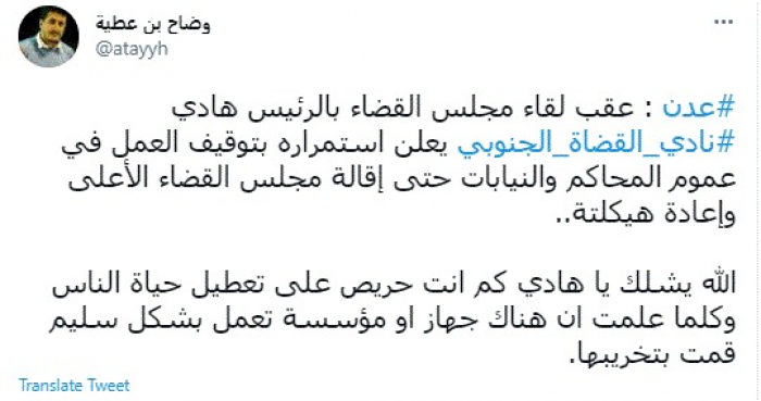 وقال في تغريدة عبر "تويتر" رصدها "المشهد العربي": "عدن: عقب لقاء مجلس القضاء بالرئيس هادي نادي القضاة الجنوبي يعلن استمراره بتوقيف العمل في عموم المحاكم والنيابات حتى إقالة مجلس القضاء الأعلى وإعادة هيكلته".