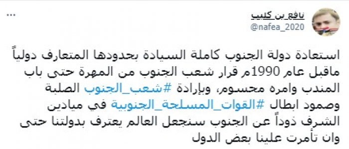 وأكد في تغريدة على حسابه بموقع التدوين المصغر تويتر، اليوم أن: "استعادة دولة الجنوب كاملة السيادة بحدودها المتعارف عليها دوليا ما قبل عام 1990م قرار شعب الجنوب من المهرة حتى باب المندب وأمره محسوم".