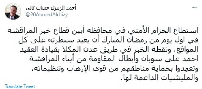 وكتب في تغريدة عبر "تويتر" رصدها "المشهد العربي": "استطاع الحزام الأمني في محافظه أبين قطاع خبر المراقشة في أول يوم من رمضان المبارك أن يعيد سيطرته على كل المواقع ونقطة الخبر في طريق عدن المكلا بقيادة العقيد احمد علي سوبان".