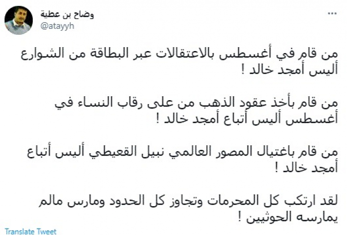 وأوضح: "من قام باغتيال المصور العالمي نبيل القعيطي أليس أتباع أمجد خالد".