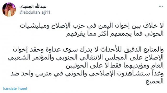 وكتب في تغريدة عبر "تويتر" رصدها "المشهد العربي": "لا خلاف بين إخوان اليمن في حزب الإصلاح ومليشيات الحوثي فما يجمعهم أكثر مما يفرقهم".