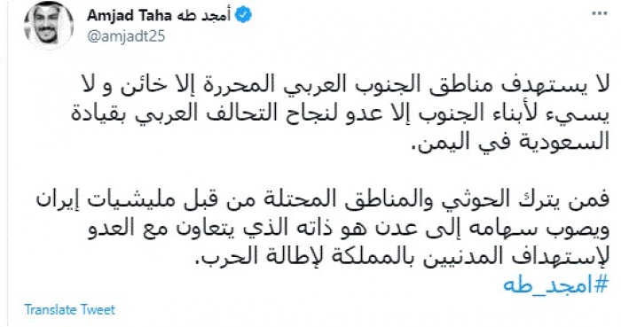 وقال في تغريدة عبر "تويتر" رصدها "المشهد العربي": "لا يستهدف مناطق الجنوب العربي المحررة إلا خائن ولا يسيء لأبناء الجنوب إلا عدو لنجاح التحالف العربي بقيادة السعودية في اليمن".