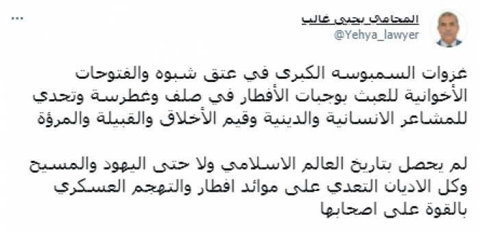 وكتب في تغريدة على حسابه بموقع التدوين المصغر تويتر، اليوم: "غزوات السمبوسة الكبرى في عتق شبوة، والفتوحات الإخوانية للعبث بوجبات الإفطار في صلف وغطرسة وتحد للمشاعر الإنسانية والدينية وقيم الأخلاق والقبيلة والمروءة".