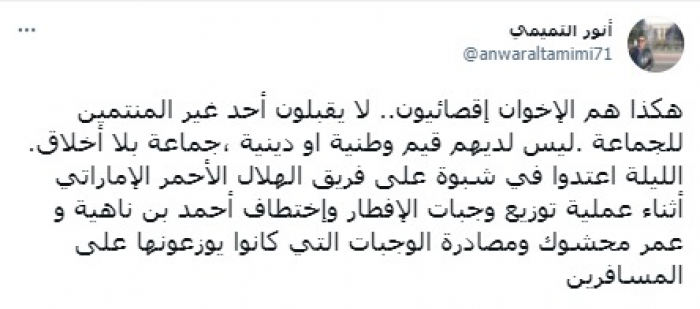 وأكد أنه: "ليس لديهم قيم وطنية أو دينية، جماعة بلا أخلاق"، مشيرا إلى أن: "الليلة اعتدوا في شبوة على فريق الهلال الأحمر الإماراتي أثناء عملية توزيع وجبات الإفطار واختطاف أحمد بن ناهية وعمر محشوك ومصادرة الوجبات التي كانوا يوزعونها على المسافرين".