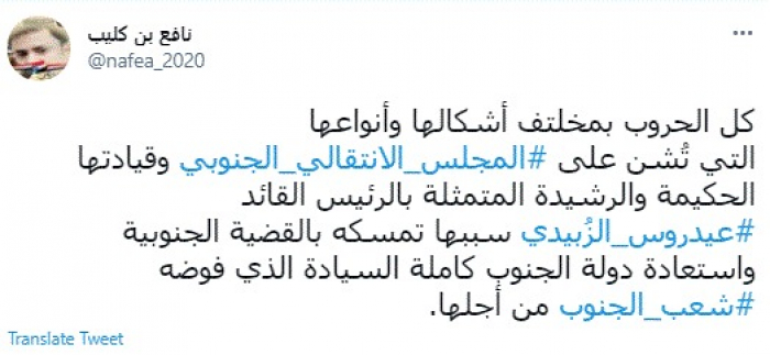 وقال في تغريدة عبر "تويتر" رصدها "المشهد العربي": "كل الحروب بمخلتف أشكالها وأنواعها التي تُشن على المجلس الانتقالي الجنوبي وقيادتها الحكيمة والرشيدة المتمثلة بالرئيس القائد عيدروس الزُبيدي سببها تمسكه بالقضية الجنوبية واستعادة دولة الجنوب كاملة السيادة الذي فوضه شعب الجنوب من أجلها".