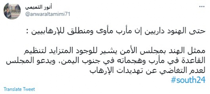وقال في تغريدة عبر "تويتر" رصدها "المشهد العربي": "حتى الهنود داريين إن مأرب مأوى ومنطلق للإرهابيين: ممثل الهند بمجلس الأمن يشير للوجود المتزايد لتنظيم القاعدة في مأرب وهجماته في جنوب اليمن، ويدعو المجلس لعدم التغاضي عن تهديدات الإرهاب".
