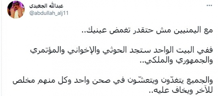 وأضاف: "ففي البيت الواحد ستجد الحوثي والإخواني والمؤتمري والجمهوري والملكي. والجميع يتغدّون ويتعشّون في صحن واحد وكل منهم مخلص للآخر ويخاف عليه".