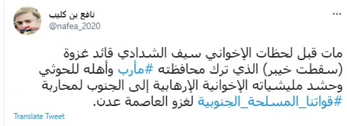 وقال في تغريدة عبر "تويتر" رصدها "المشهد العربي": "مات قبل لحظات الإخواني سيف الشدادي قائد غزوة (سقطت خيبر) الذي ترك محافظته مأرب وأهله للحوثي وحشد مليشياته الإخوانية الإرهابية إلى الجنوب لمحاربة قواتنا المسلحة الجنوبية لغزو العاصمة عدن".